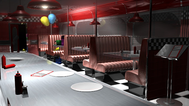 The camera has been moved to the other side of the diner. The booth in the foreground is a really interesting element, and if I were to go forward with the 'Birthday' idea, this would be a great point in which to display the items.